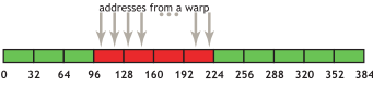 如上图所示,是凝聚化访存的第一种也是最简单的情况:第 k 个线程访问 32Byte 对齐数组中的第 k 个字(int 或者 float)。在上图中,同一个 warp 的 32 个线程各自访问 4 个 Byte,由于边界刚好对齐在内存的 32Byte 处,内存控制器可以将其合并成 4 个 32Byte 事务,这已经是最少的事务数量了。值得一提的是,在过去的较低计算能力的 Cuda 下,如果这 4 个 32Byte 片段内的访问是非顺序的(譬如线程 m 访问第 n 个字,线程 n 访问第 m 个字),此时将无法合并访问事务。 但是对于 6.0 以上的版本,即便线程的访问顺序重排,只要它还是连续且对齐的,就能合并事务。