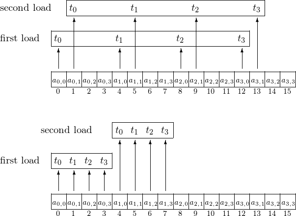 在 for 循环的每次迭代中,一个 warp 的线程将会读取矩阵 B 的块内的一行,即 b[i * N + col],这一访存是凝聚化的。然而,同一个 warp 的线程会在同一时刻同时访问矩阵 A 的行的同一个元素,即 a[row * w + i]。尽管这只需要 1 个内存事务,但是带宽仍然被浪费了,因为这个 32Byte 的内存事务只有 4Byte 被利用了。理想状态下,我们会希望只读取 A 的行上的元素一次,之后重复利用。如下所示。