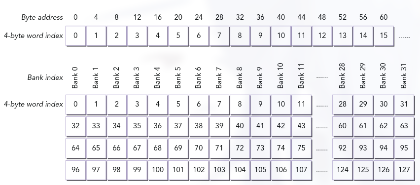 共享内存在片上存储,相比全局内存和本地内存有着更高的带宽和更低的延迟。然而,前提是没有出现 Bank Conflict。在实际架构上,共享内存被划分为 32 个 Bank,这些 Bank 的组织方式是:将连续的 4Byte 字映射到连续的 Bank 中,即第 1 个字映射到 Bank0、第 2 个字映射到 Bank1、……第 32 个字映射到 Bank31、第 33 个字又绕回来映射到 Bank0,以此类推。 如下图。